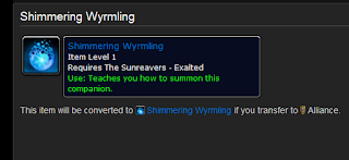 Going through my pet searches for bargains I saw a Shimmering Wyrmling for sale. I hadn't seen one of these for sale for a bit (since Wrath and the introduction of Champion Seals. It was a Bind on Equip item and not having seen one for a bit I debated on buying it to flip. Then I looked at the description.